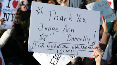 Em pouco tempo Ann Donnelly conseguiu a suspensão da Ordem Executiva, advogando que esta viola uma lei de 1965 que baniu a discriminação com base na nacionalidade. E não só mas essa é uma guerra para os próximos dias, de momento alguém deu um abençoado murro na mesa.